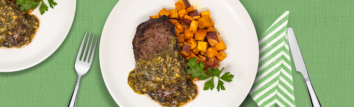 Entertaining made easy! In under 10 minutes, you’ll have a restaurant-quality, seared steak at home! Complement the pan-seared steak with a bright chimichurri sauce that has the perfect balance of cilantro, lime, and garlic.