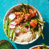 Top the risotto with chicken and garnish with the remaining green onions, nori, additional Parmesan and chilies.