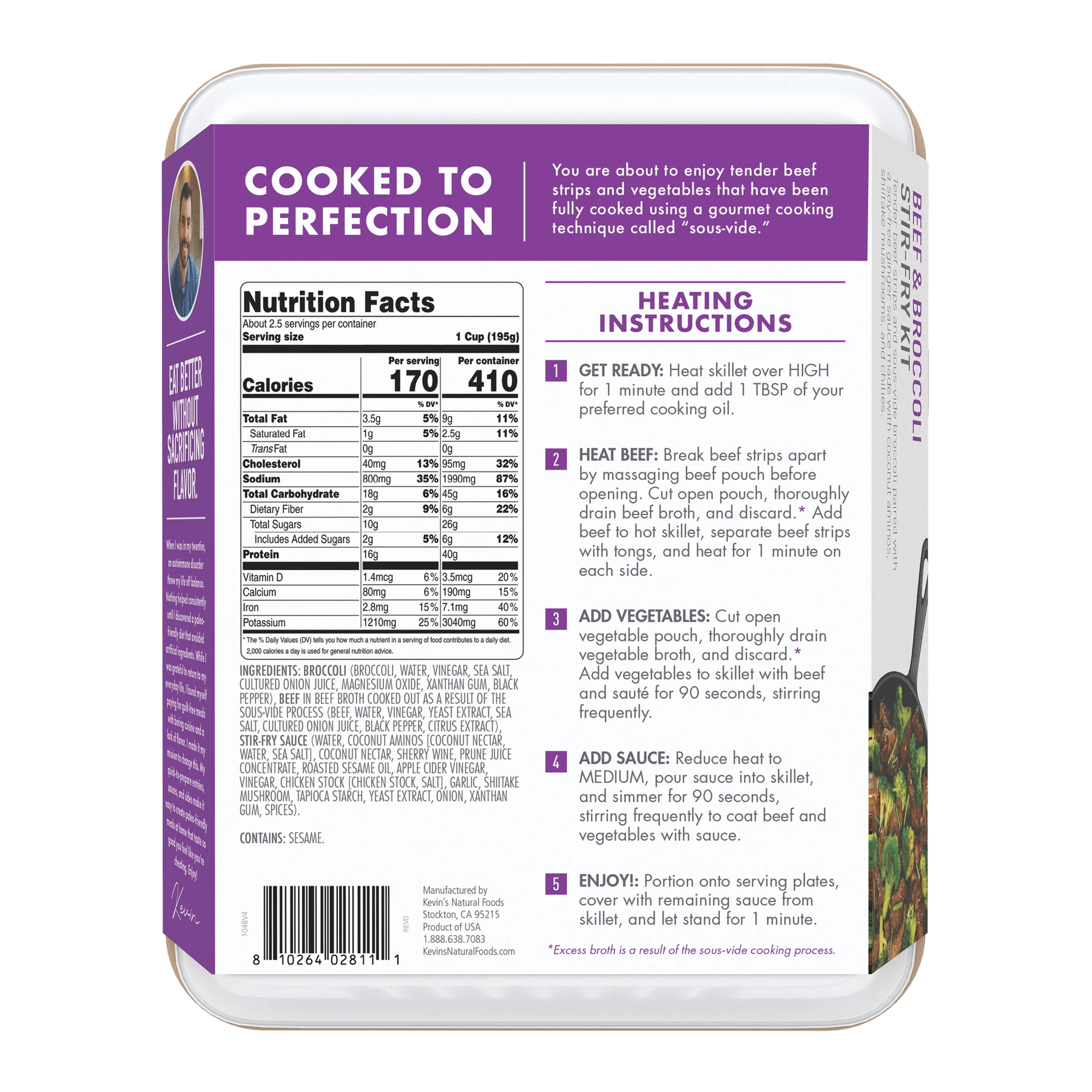 Broccoli (Broccoli, Water, Vinegar, Sea Salt, Cultured Onion Juice, Magnesium Oxide, Xanthan Gum, Black Pepper), Beef Sirloin In Beef Broth Cooked Out As A Result Of The Sous-Vide Process (Beef, Water, Vinegar, Yeast Extract, Sea Salt, Cultured Onion Juice, Black Pepper, Citrus Extract), Stir Fry Sauce (Water, Coconut Aminos [Coconut Nectar, Water, Sea Salt], Coconut Nectar, Sherry Wine, Prune Juice Concentrate, Roasted Sesame Oil, Apple Cider Vinegar, Vinegar, Chicken Stock [Chicken Stock, Salt], Garlic, Shiitake Mushroom, Tapioca Starch, Yeast Extract, Onion, Xanthan Gum, Spices).
