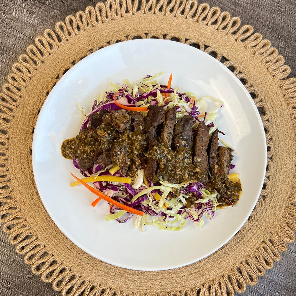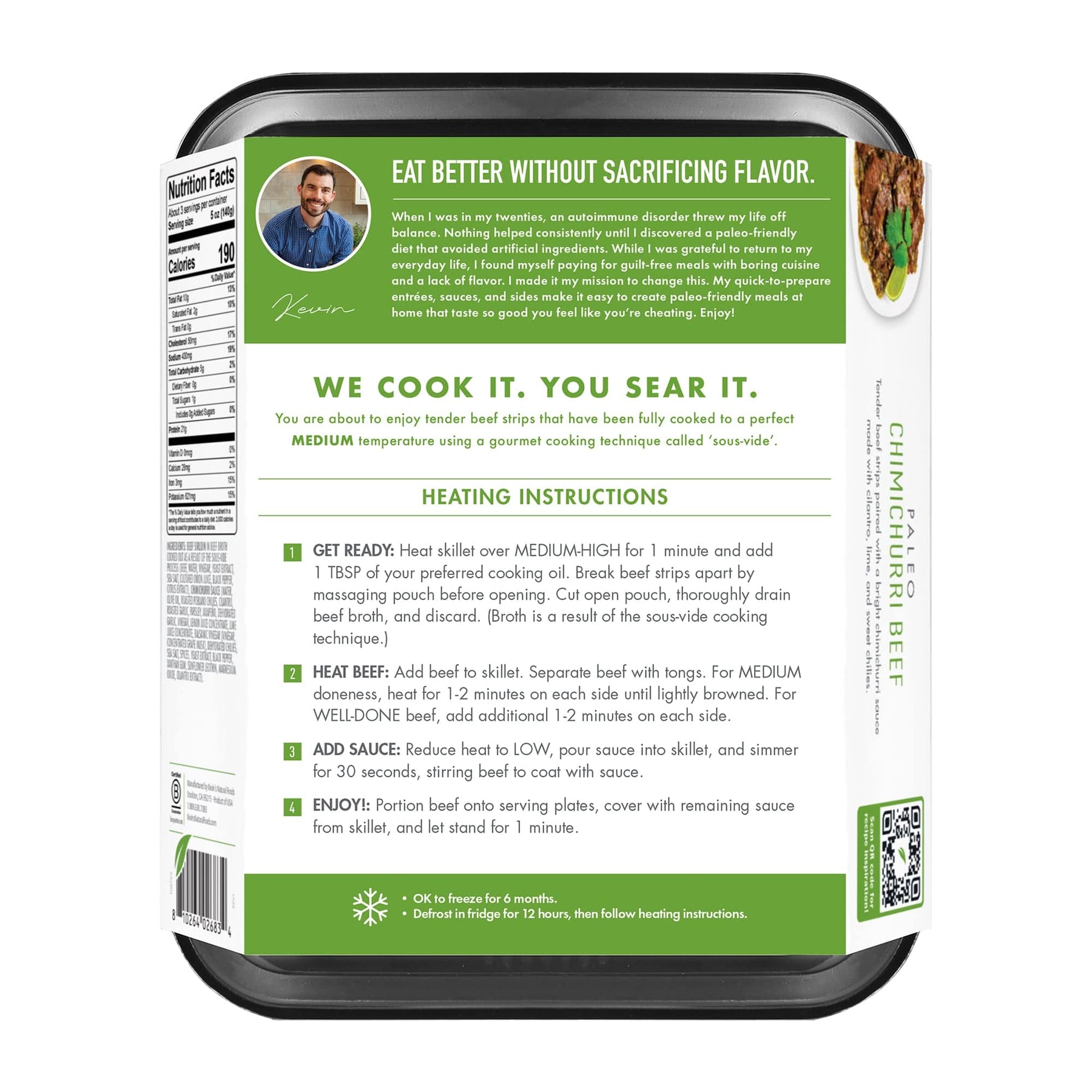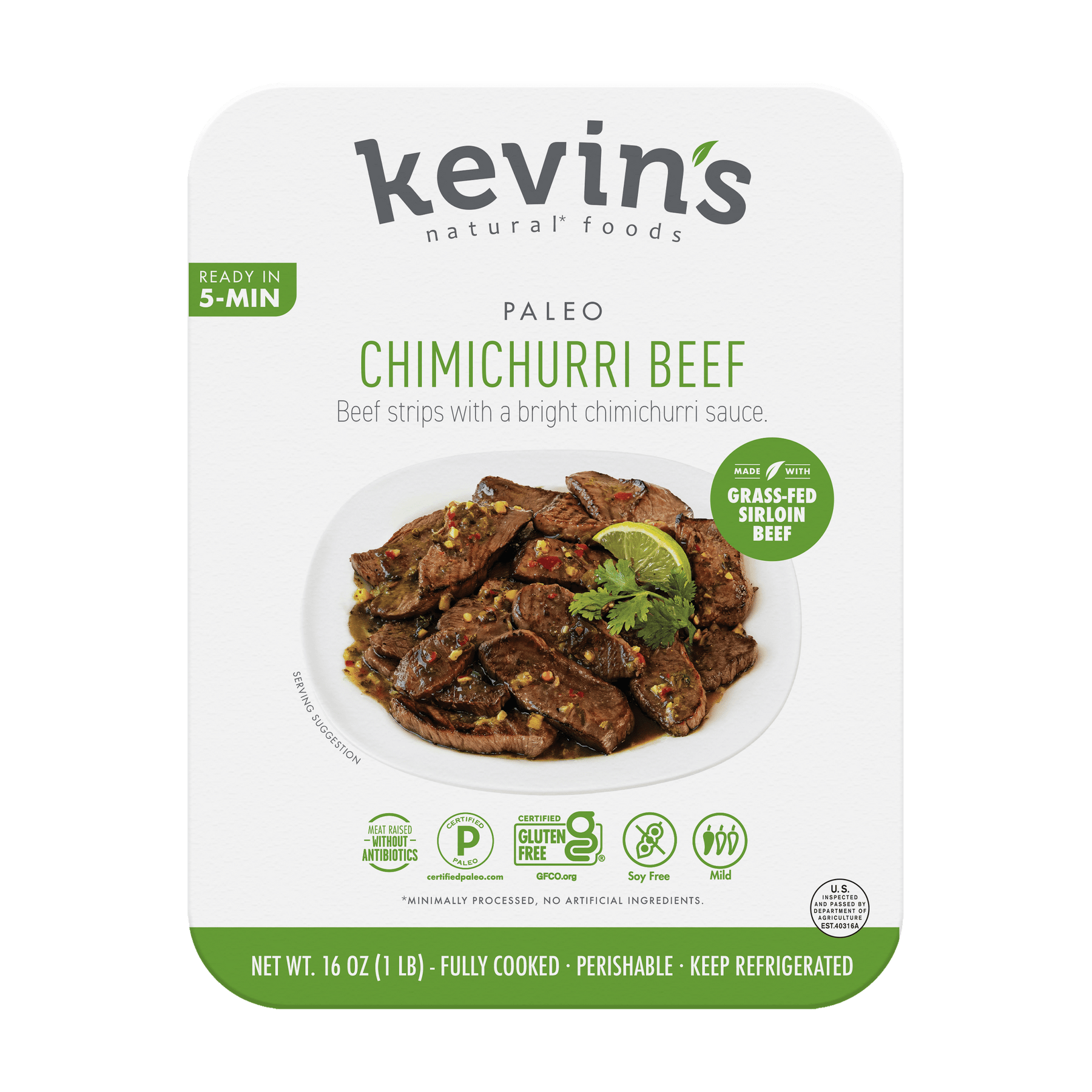 Grass-Fed Beef in broth cooked out as a result of the sous-vide process (Beef, Water, Vinegar, Yeast Extract, Onion Powder, Sea Salt, Black Pepper, Citrus Extract), Chimichurri Sauce (Water, Olive Oil, Roasted Poblano Chilies, Cilantro, Roasted Garlic, Parsley, Jalapeño, Dehydrated Garlic, Vinegar, Lemon Juice Concentrate, Lime Juice Concentrate, Balsamic Vinegar [Vinegar, Concentrated Grape Musk], Dehydrated Chilies, Sea Salt, Spices, Yeast Extract, Black Pepper, Xanthan Gum, Sunflower Lecithin, Magnesium Oxide, Cilantro Extract).