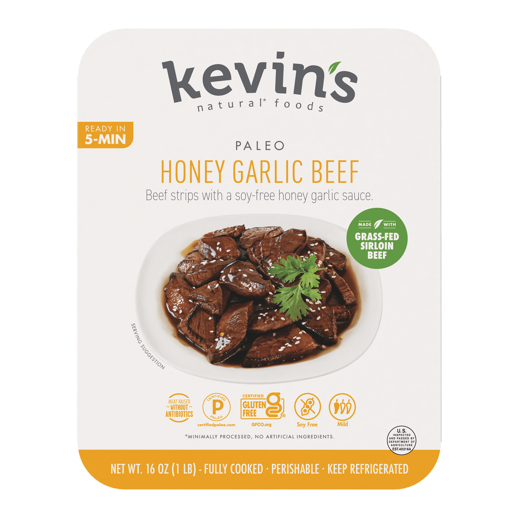 Grass-Fed beef in beef broth cooked out as a result of the sous-vide process (Beef, Water, Vinegar, Yeast Extract, Onion Powder, Sea Salt, Black Pepper, Citrus Extract), Honey Garlic Sauce (Coconut Aminos [Coconut Nectar, Water, Sea Salt], Water, Coconut Sugar, Vinegar, Honey, Orange Juice Concentrate, Roasted Garlic, Tapioca Starch, Dehydrated Garlic, Yeast Extract, Xanthan Gum, Dehydrated Ginger, Granulated Onion, Dehydrated Chilies, Orange Oil, Monk Fruit Extract).