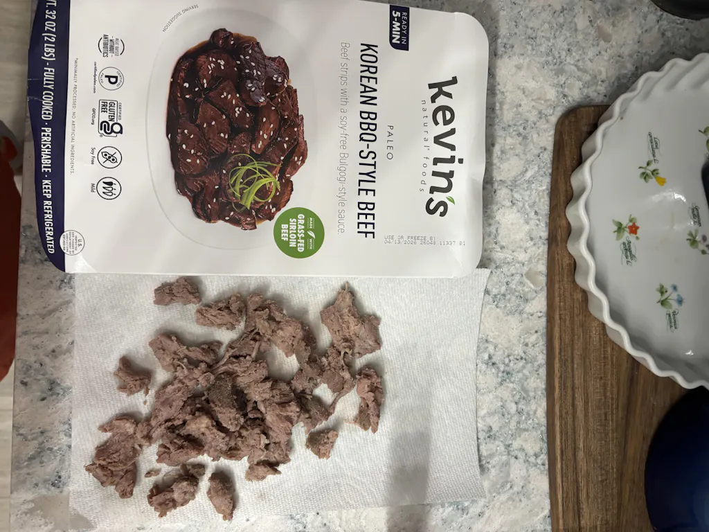 Grass-Fed Beef in beef broth cooked out as a result of the Sous-Vide process (Beef, Water, Vinegar, Yeast Extract, Onion Powder, Sea Salt, Black Pepper, Citrus Extract), Korean Bbq Sauce (Water, Coconut Aminos [Coconut Nectar, Water, Sea Salt], Vinegar, Coconut Sugar, Roasted Sesame Oil, Lemongrass Puree [Lemongrass, Water], Tapioca Starch, Yeast Extract, Cilantro, Dehydrated Onion, Spices, Dehydrated Garlic, Shiitake Mushroom, Xanthan Gum, Dehydrated Ginger, Monk Fruit Extract).