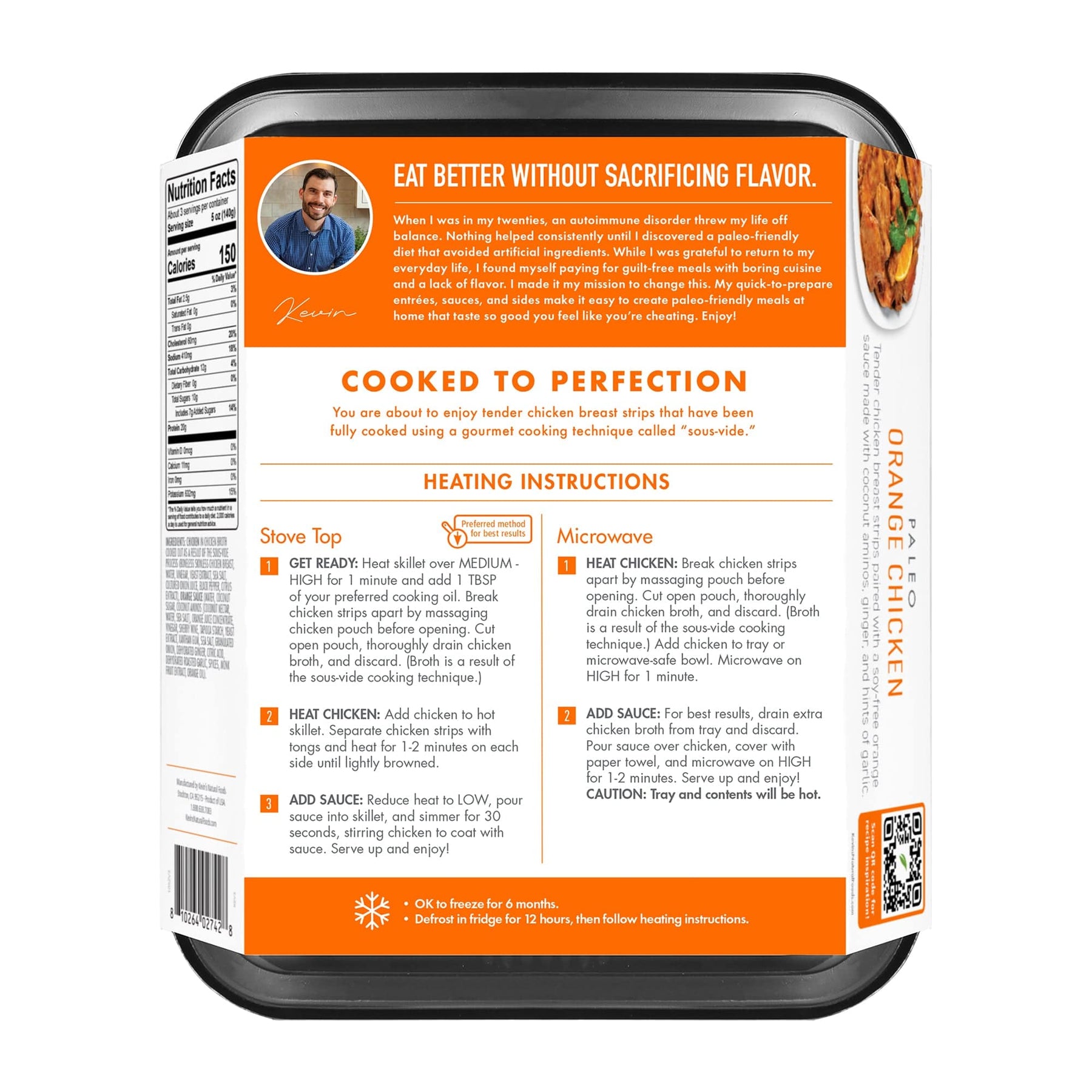 Chicken In Chicken Broth Cooked Out As A Result Of The Sous-Vide Process (Boneless Skinless Chicken Breast, Water, Vinegar, Yeast Extract, Sea Salt, Cultured Onion Powder, Black Pepper, Citrus Extract), Orange Sauce (Water, Coconut Sugar, Coconut Aminos [Coconut Nectar, Water, Sea Salt], Orange Juice Concentrate, Vinegar, Sherry Wine, Tapioca Starch, Yeast Extract, Xanthan Gum, Sea Salt, Granulated Onion, Dehydrated Ginger, Citric Acid, Dehydrated Roasted Garlic, Spices, Monk Fruit Extract, Orange Oil).