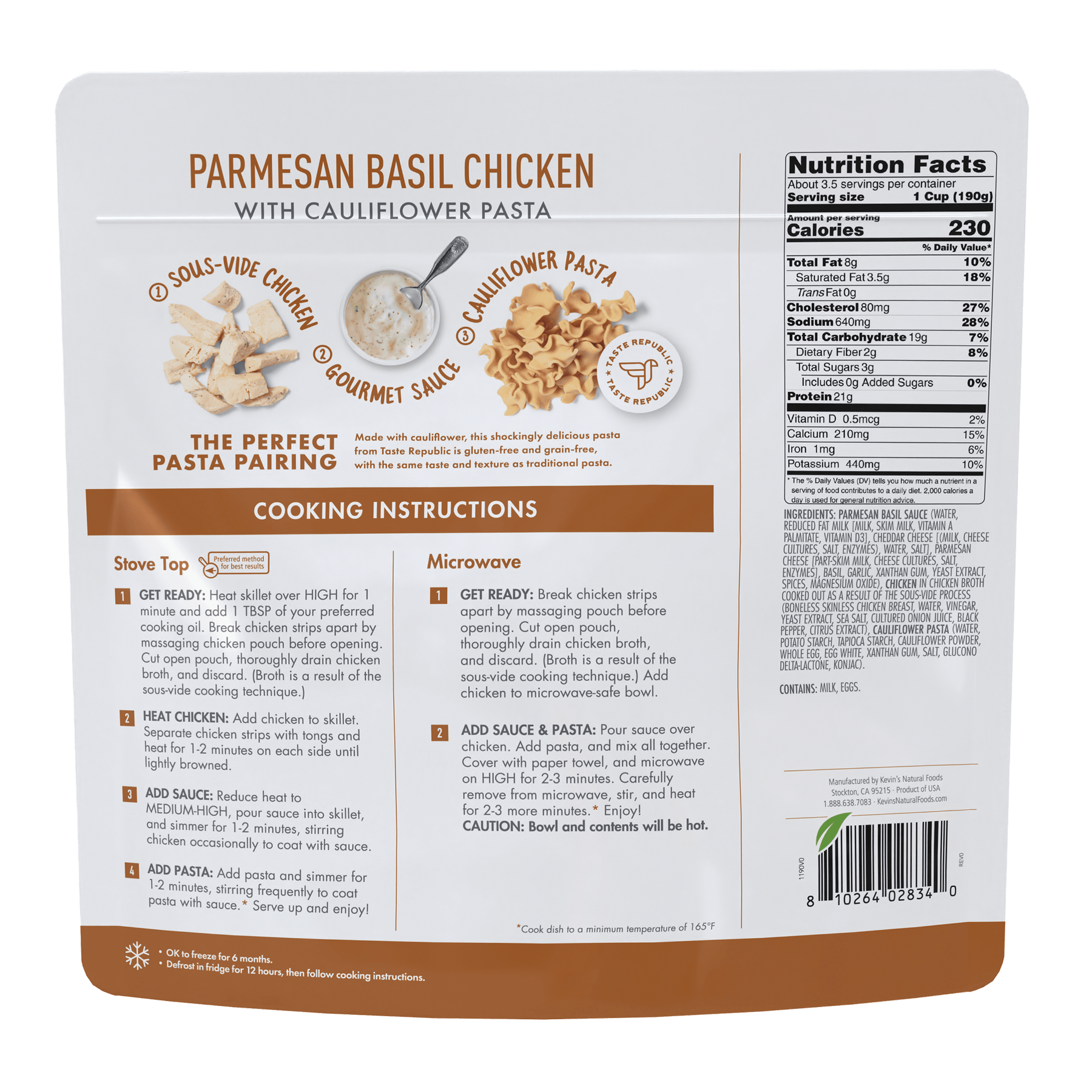 Parmesan Basil Sauce (Water, Reduced Fat Milk [Milk, Skim Milk, Vitamin A Palmitate, Vitamin D3], Cheddar Cheese [(Milk, Cheese Cultures, Salt, Enzymes), Water, Salt], Parmesan Cheese [Part-Skim Milk, Cheese Cultures, Salt, Enzymes], Basil, Garlic, Xanthan Gum, Yeast Extract, Spices, Magnesium Oxide), Cauliflower Pasta (Water, Cauliflower Powder, Potato Starch, Tapioca Starch, Whole Egg, Egg White, Xanthan Gum, Salt, Glucono Delta-Lactone, Konjac), Chicken In Chicken Broth Cooked Out As A Result Of The Sous-Vide Process (Boneless Skinless Chicken Breast, Water, Vinegar, Yeast Extract, Sea Salt, Cultured Onion Juice, Black Pepper, Citrus Extract).