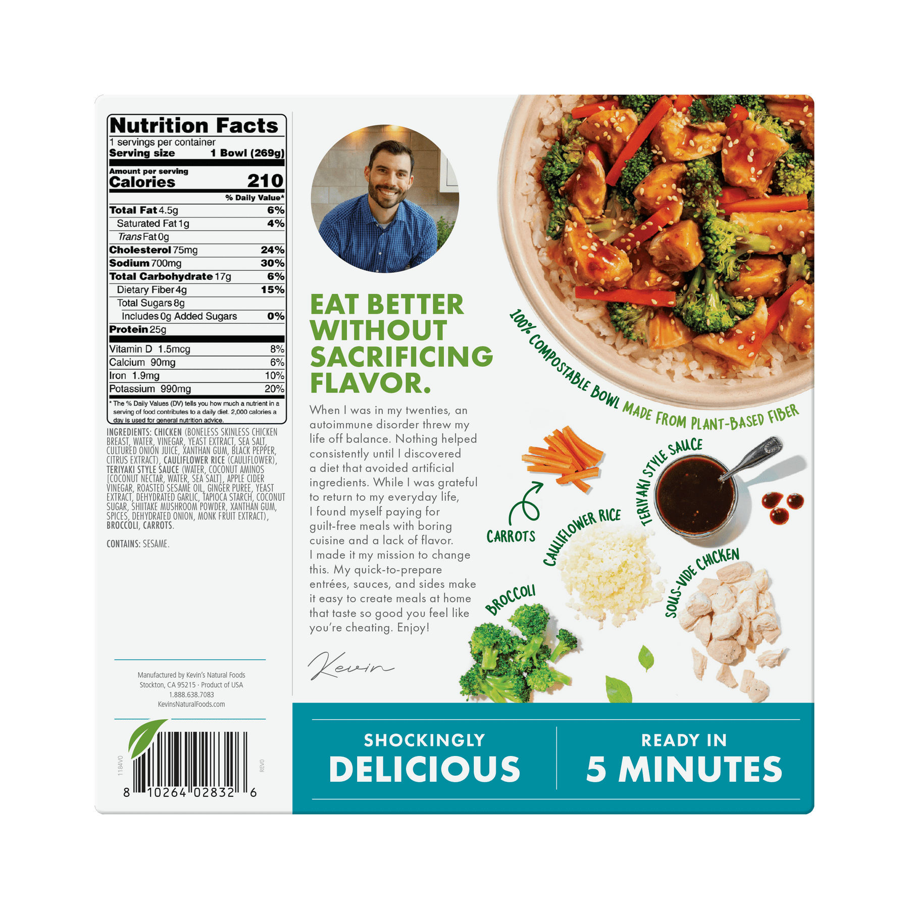 Chicken (Boneless Skinless Chicken Breast, Water, Vinegar, Yeast Extract, Sea Salt, Cultured Onion Juice, Xanthan Gum, Black Pepper, Citrus Extract), Cauliflower Rice (Cauliflower), Teriyaki Style Sauce (Water, Coconut Aminos [Coconut Nectar, Water, Sea Salt], Apple Cider Vinegar, Roasted Sesame Oil, Ginger Puree, Yeast Extract, Dehydrated Garlic, Tapioca Starch, Coconut Sugar, Shiitake Mushroom Powder, Xanthan Gum, Spices, Dehydrated Onion, Monk Fruit Extract), Broccoli, Carrots.