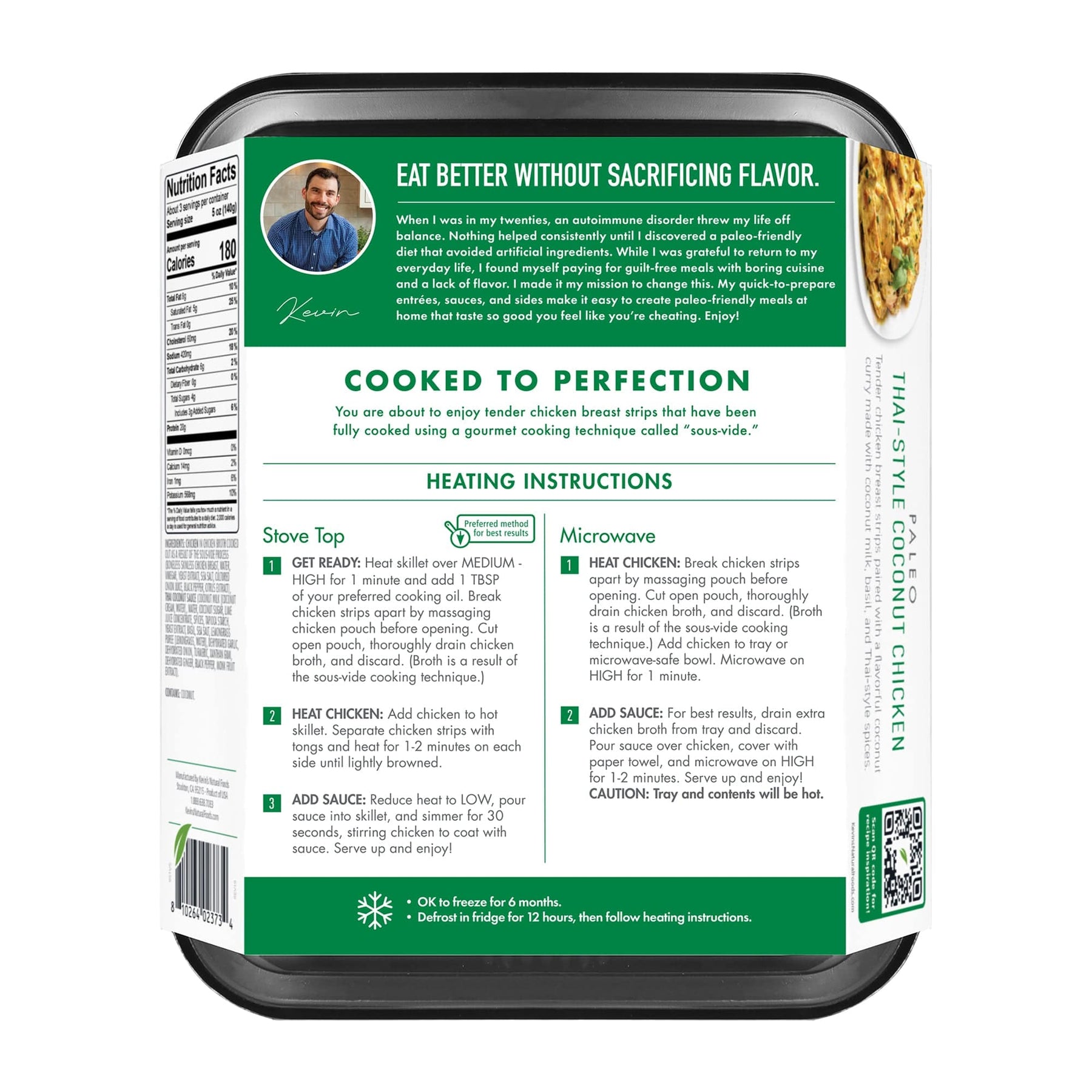 Chicken In Chicken Broth Cooked Out As A Result Of The Sous-Vide Process (Boneless Skinless Chicken Breast, Water, Vinegar, Yeast Extract, Sea Salt, Cultured Onion Juice, Black Pepper, Citrus Extract), Thai Coconut Sauce (Coconut Milk [Coconut Cream, Water], Water, Coconut Sugar, Lime Juice Concentrate, Spices, Tapioca Starch, Yeast Extract, Basil, Sea Salt, Lemongrass Puree [Lemongrass, Water], Dehydrated Garlic, Dehydrated Onion, Turmeric, Xanthan Gum, Dehydrated Ginger, Black Pepper, Monk Fruit Extract).