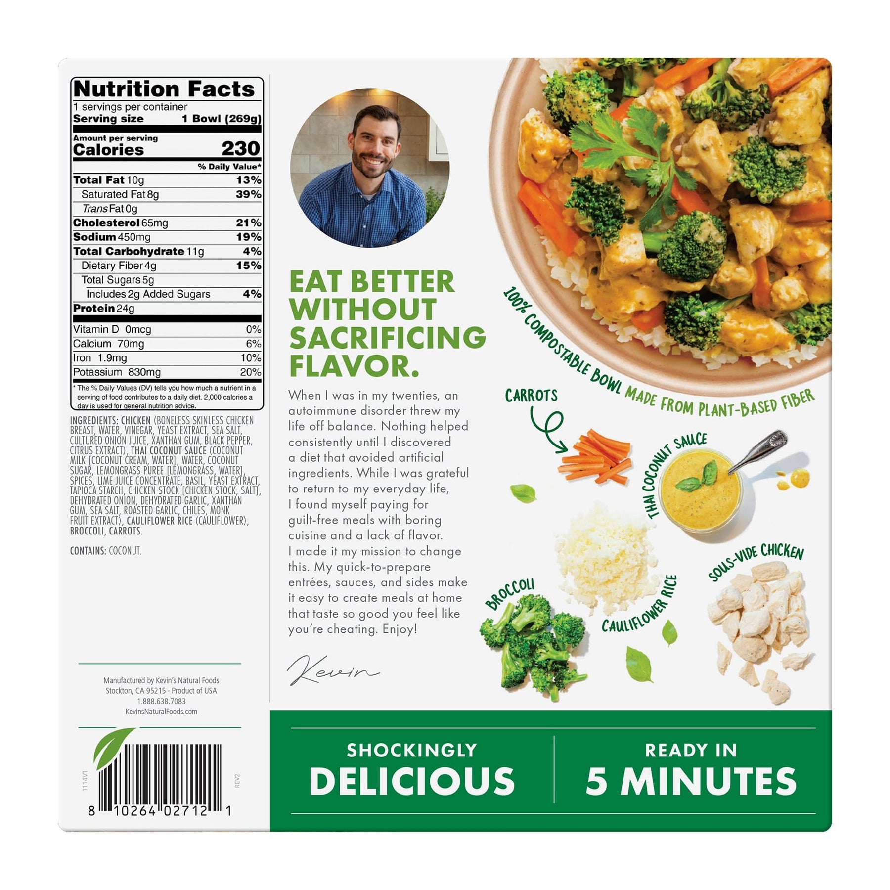 Chicken (Boneless Skinless Chicken Breast, Water, Vinegar, Yeast Extract, Sea Salt, Cultured Onion Juice, Xanthan Gum, Black Pepper, Citrus Extract), Thai Coconut Sauce (Coconut Milk [Coconut Cream, Water], Water, Coconut Sugar, Lemongrass Puree [Lemongrass, Water], Spices, Lime Juice Concentrate, Basil, Yeast Extract, Chicken Stock [Chicken Stock, Salt], Dehydrated Onion, Dehydrated Garlic, Xanthan Gum, Sea Salt, Roasted Garlic, Tapioca Starch, Chiles, Monk Fruit Extract), Cauliflower Rice (Cauliflower), Broccoli, Carrots.
